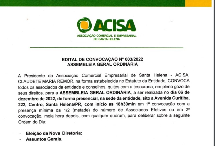 A Associação Comercial Empresarial de Santa Helena (Acisa) publicou no início de novembro edital de convocação aos associados para Assembleia Geral Ordinária (AGO), no dia 06, de dezembro, de forma presencial. O evento tem como pauta principal a eleição de nova diretoria.