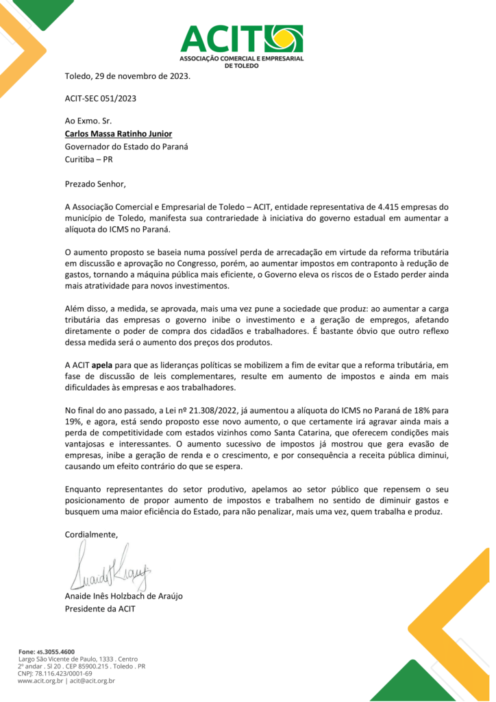 A Associação Comercial e Empresarial de Toledo (ACIT), entidade representativa de 4.415 empresas do município de Toledo, manifesta sua contrariedade à iniciativa do governo estadual em aumentar a alíquota do ICMS no Paraná.