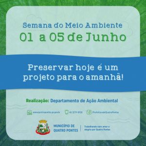 Neste dia 1º, até sábado (05), celebra-se a Semana do Meio Ambiente. Com o objetivo de estimular a reflexão e conscientizar a comunidade sobre a importância de preservar os diferentes tipos de ecossistemas, o Departamento de Ação Ambiental de Quatro Pontes, ligado à Secretaria de Desenvolvimento Econômico, realiza ações individuais e coletivas, iniciadas já no mês passado.