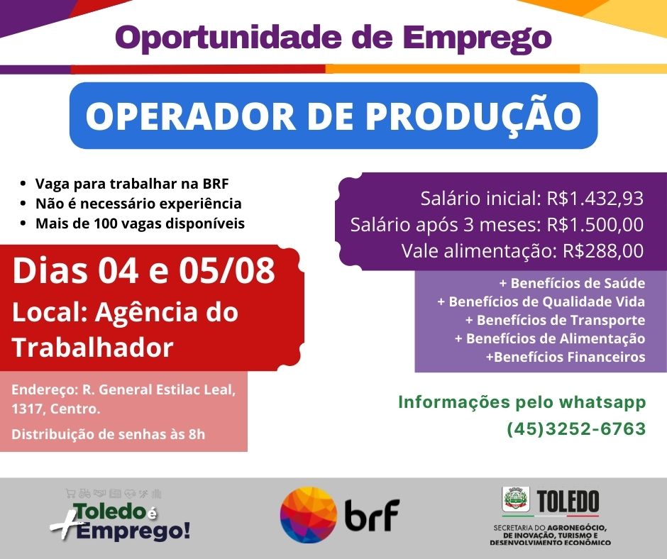 A Agência do Trabalhador de Toledo promove um mutirão de contratações para vagas disponíveis na BRF, indústria transnacional do ramo de alimentos.