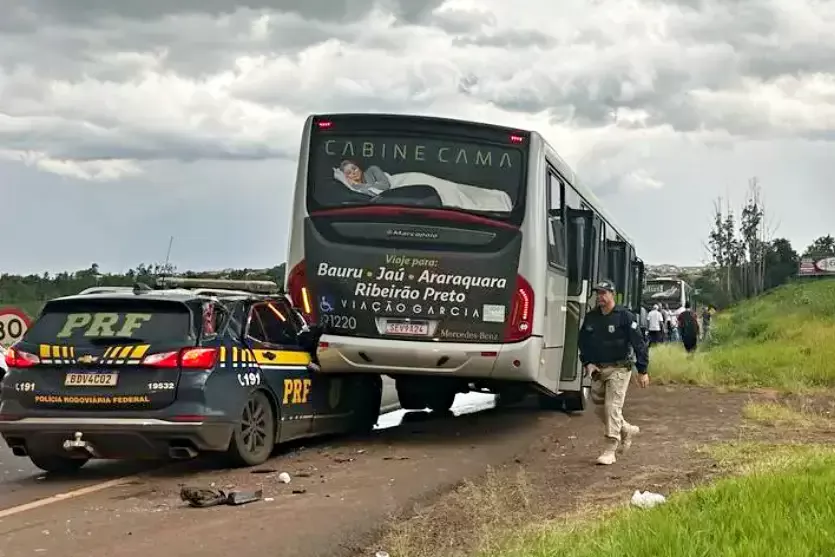 Uma colisão entre uma viatura da PRF e um ônibus deixou dois policiais feridos. O acidente aconteceu no km 153 da rodovia BR-376 na sexta-feira (21), no município de Mandaguaçu (região de Maringá).