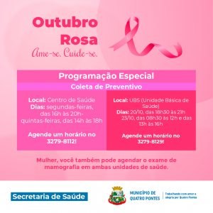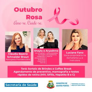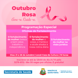 A Secretaria de Saúde de Quatro Pontes segue com as inscrições abertas para a oficina “O fortalecimento da mulher na visão jurídica” da campanha Outubro Rosa, que será na quinta-feira (28). As munícipes interessadas devem confirmar a participação pelo telefone 3279-8112.