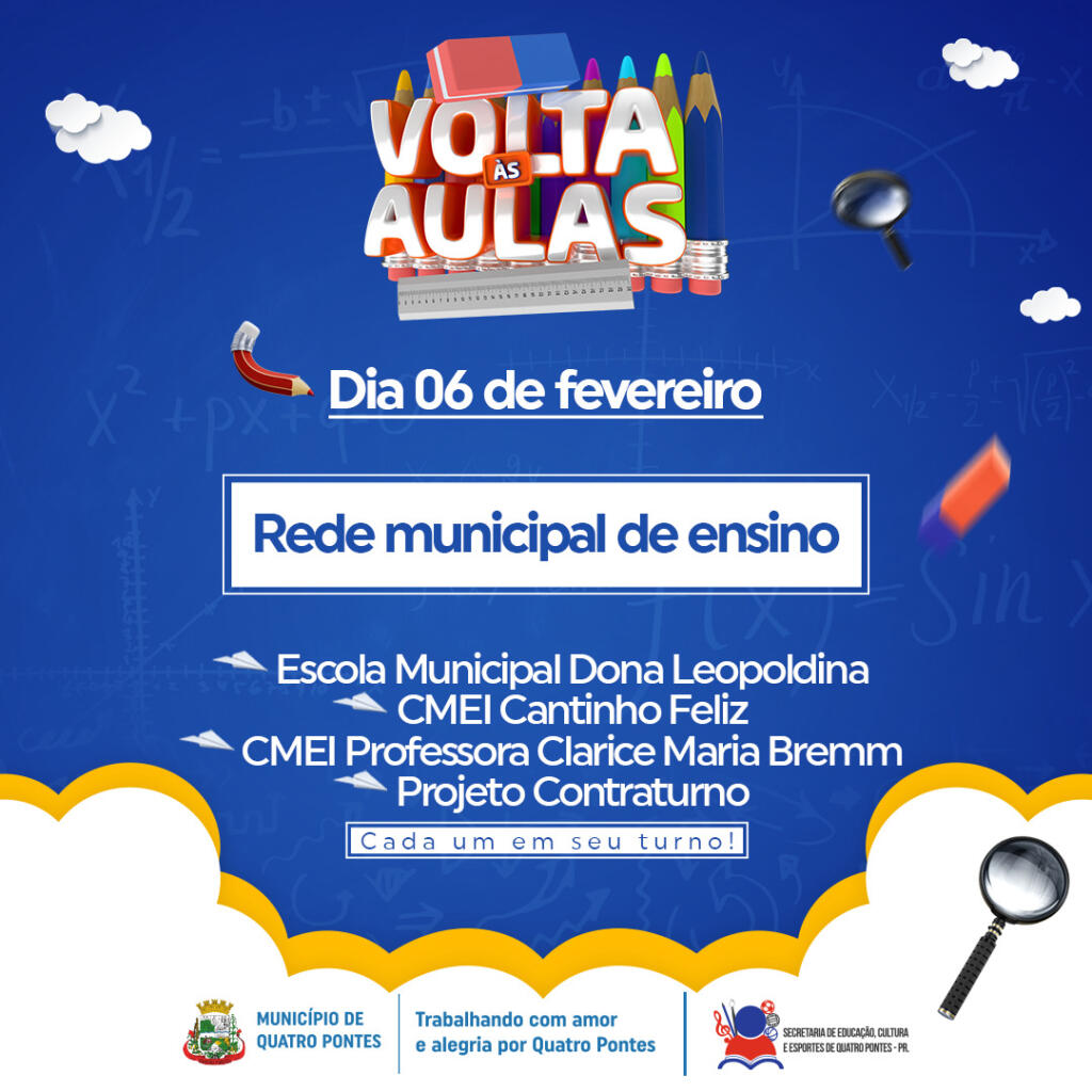Em Quatro Pontes, a Escola Municipal Dona Leopoldina, o Centro Municipal de Educação Infantil (CMEI) Professora Clarice Maria Bremm, o CMEI Cantinho Feliz e o projeto contraturno, com a coordenação da Secretaria de Educação, Cultura e Esportes, estão concluindo a organização para receber os alunos na volta às aulas na segunda-feira (06), quando terá transporte escolar normal.