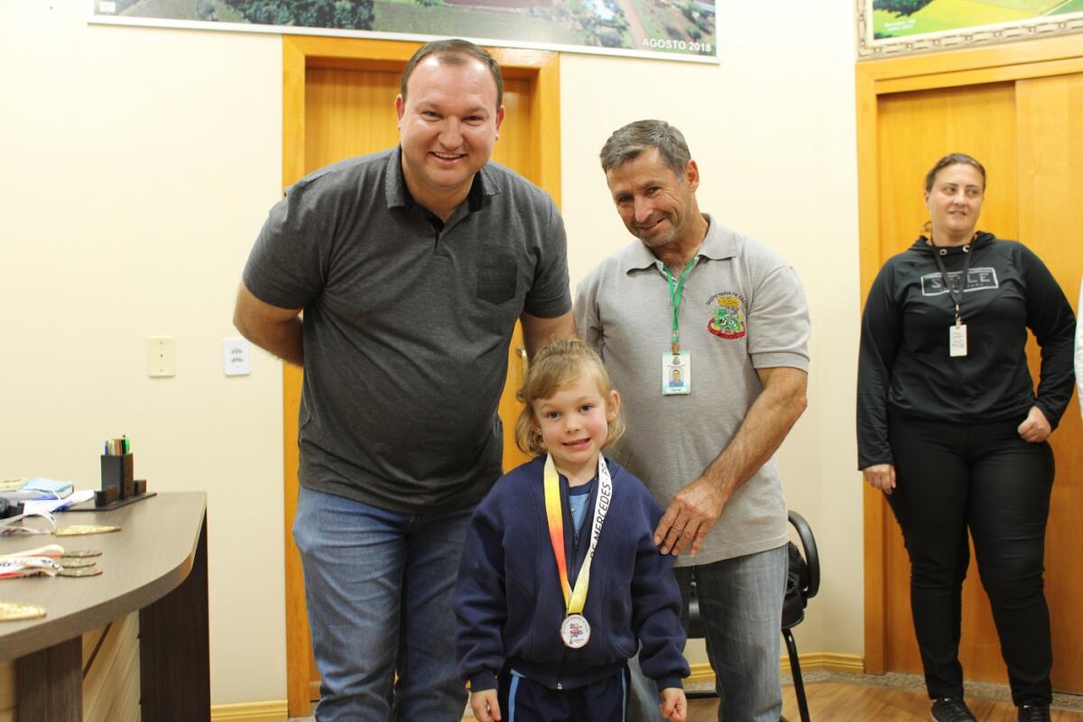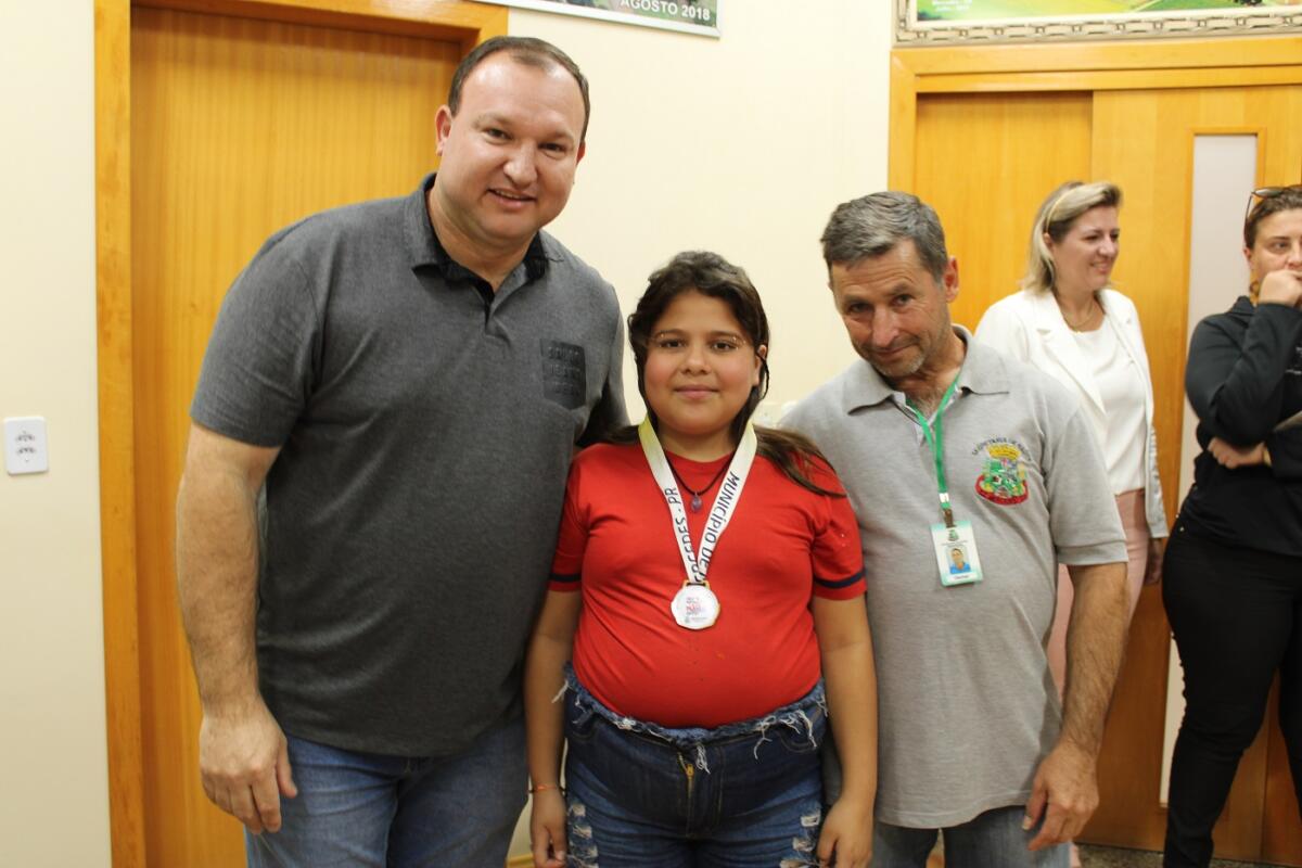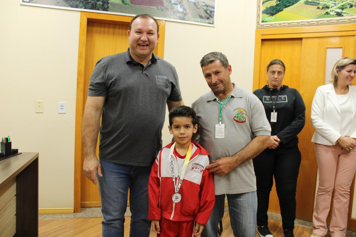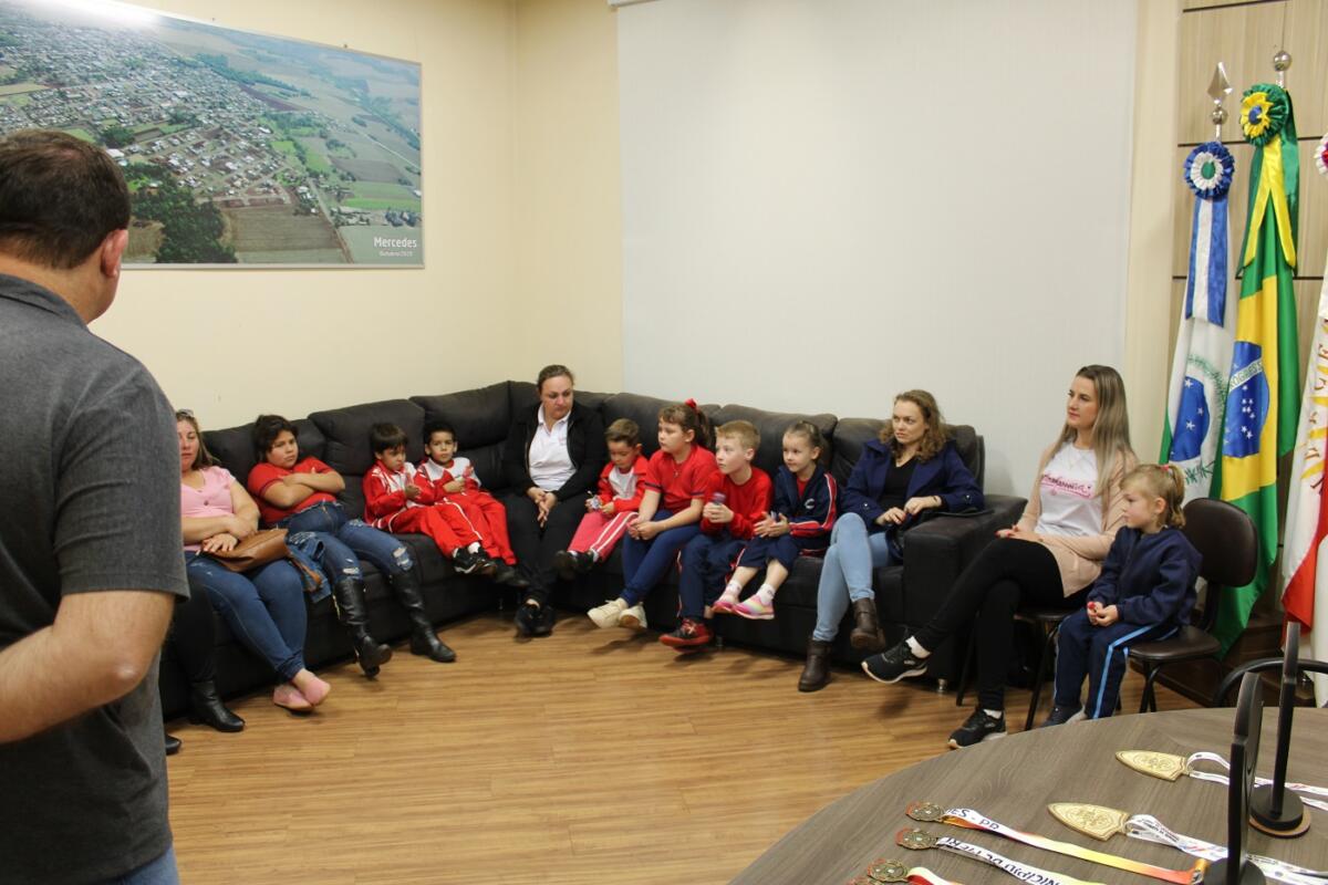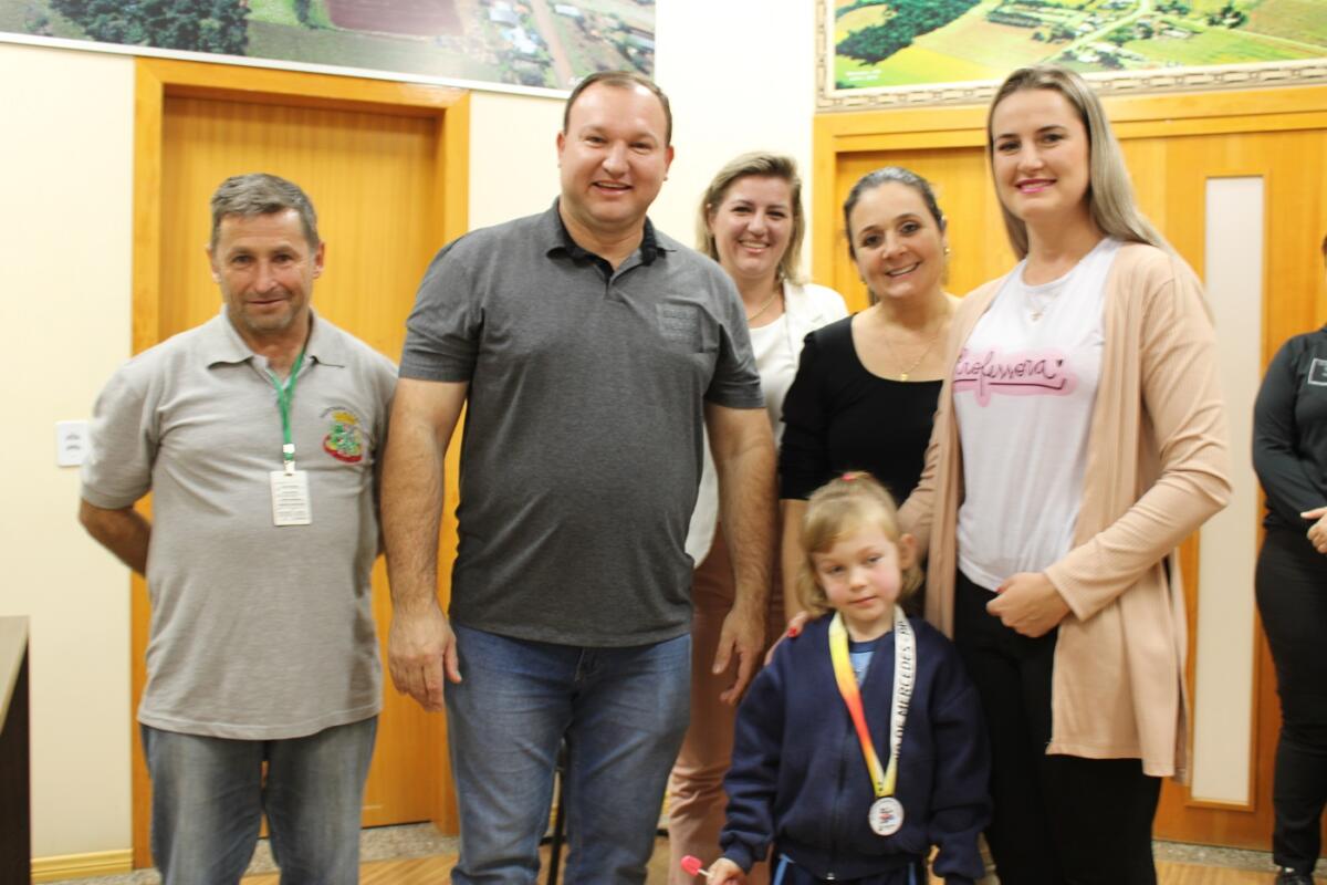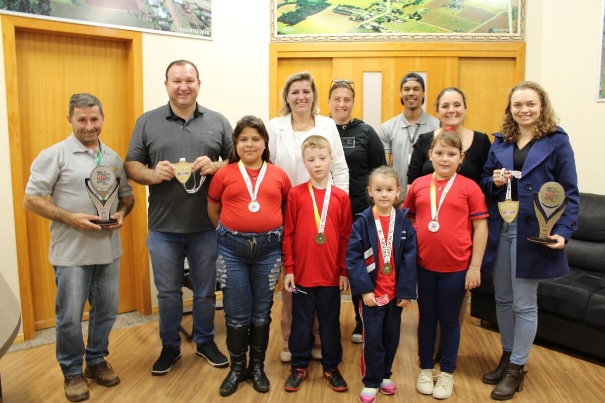 Na última segunda (15), o prefeito Laerton Weber recebeu alunos, pais, professores e integrantes da Secretaria de Saúde para a entrega dos troféus e medalhas conquistados na campanha.