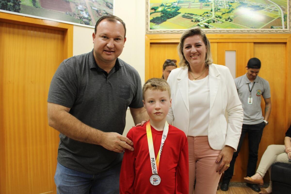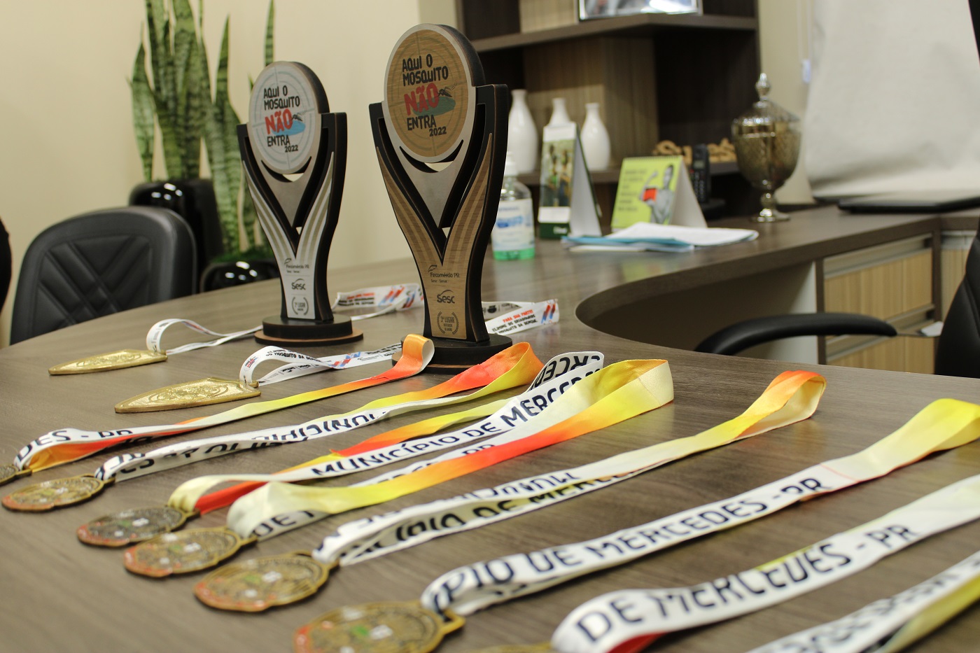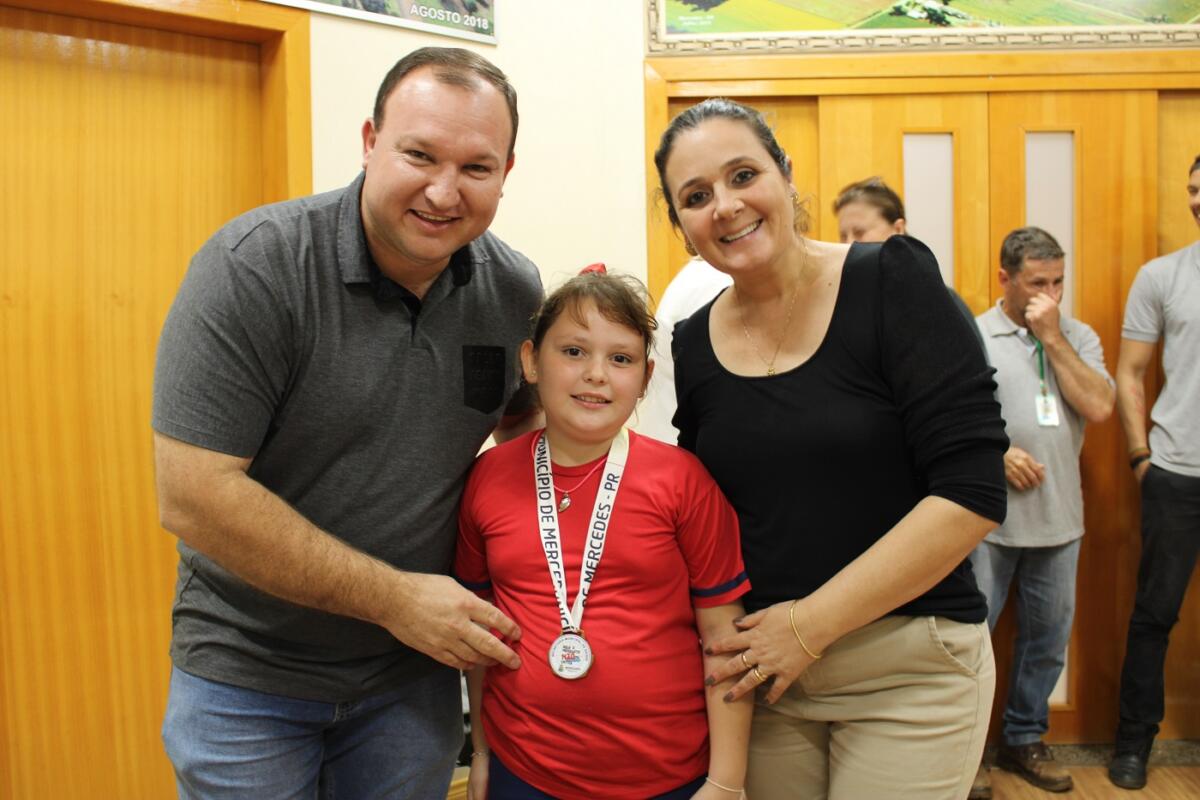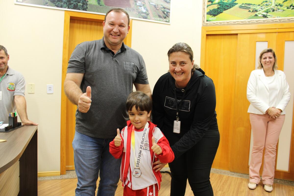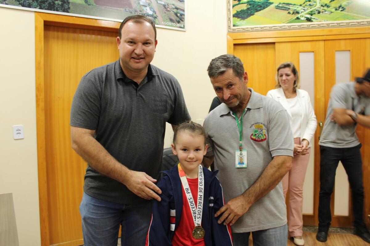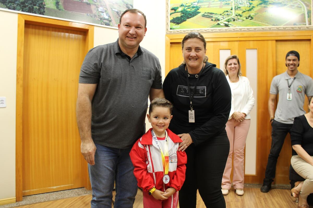 Na última segunda (15), o prefeito Laerton Weber recebeu alunos, pais, professores e integrantes da Secretaria de Saúde para a entrega dos troféus e medalhas conquistados na campanha.