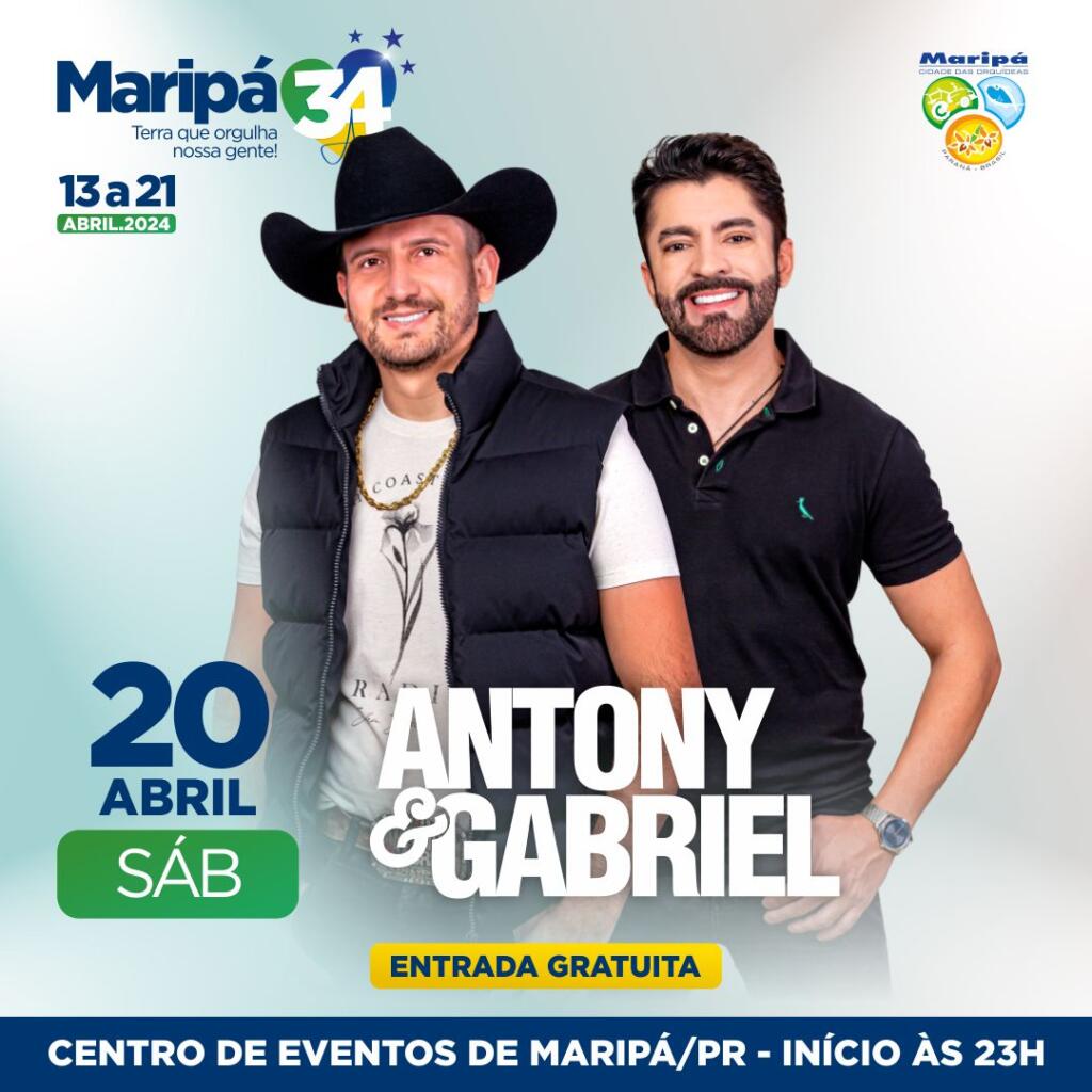 A festividade em comemoração aos 34 anos de emancipação político-administrativa do Município de Maripá vai contar com um show nacional da dupla sertaneja Antony & Gabriel. O show vai ocorrer no dia 20 de abril, às 23 horas no Centro Municipal de Eventos, com entrada gratuita.