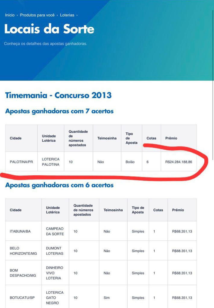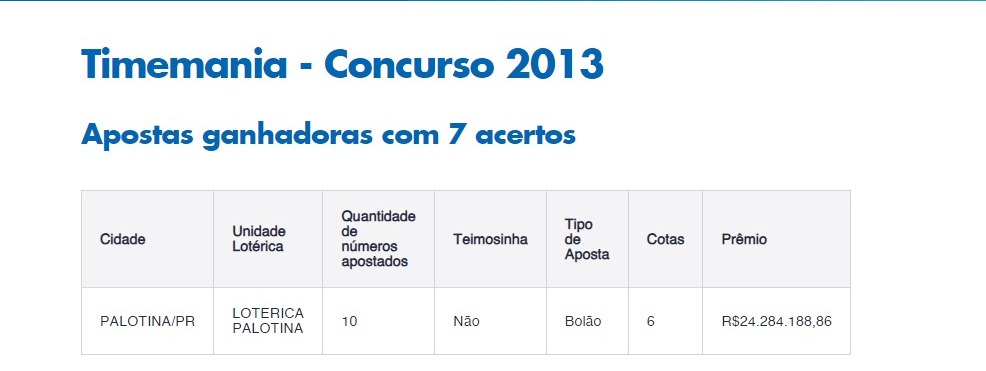 Apostadores de Palotina fizeram bolão com seis cotas e acertaram as sete dezenas do Concurso 2013 da Timemania. O ganhadores levaram o prêmio de R$ 24.284.188,86.