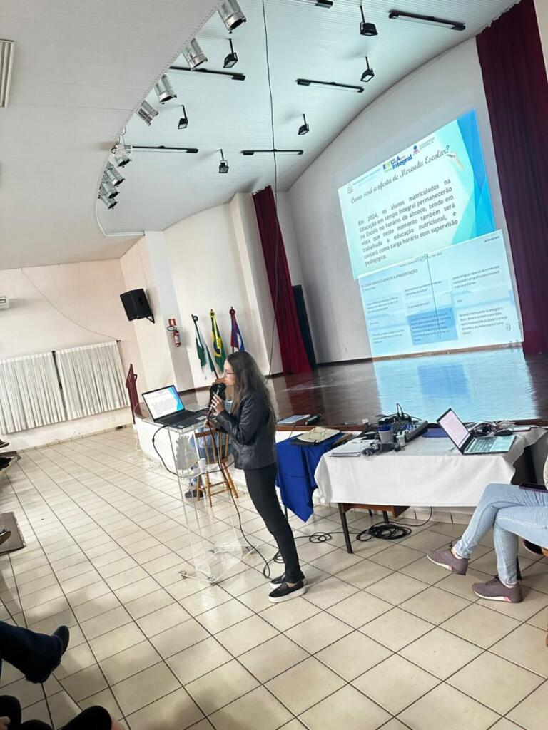 Em relação ao transporte escolar foi explicado que em 2024, o transporte escolar será ofertado nas mesmas rotas e horários de 2023, conforme contratos em andamento. Alunos que farão matrícula na educação em tempo integral e necessitam de transporte escolar terão que se adaptar nas rotas existentes e nos horários disponíveis. Quanto à merenda escolar, em 2024 os alunos matriculados na educação em tempo integral permanecerão na escola no horário do almoço, tendo em vista que neste momento também será trabalhada a educação nutricional e contará como carga horária com supervisão pedagógica, ou seja, o almoço na escola será compulsório aos alunos.