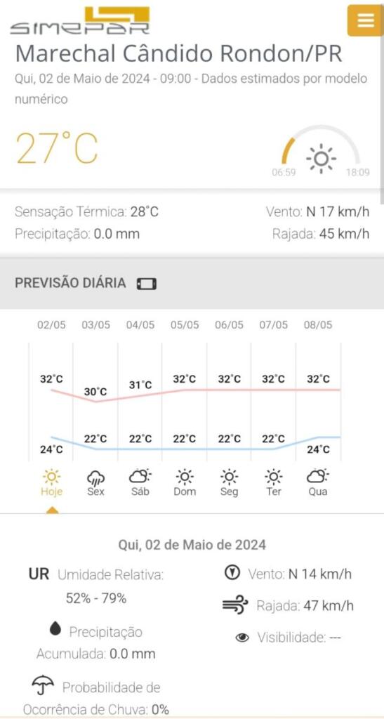 Em Marechal Cândido Rondon, a máxima prevista para hoje é de 32ºC; não há previsão de huva.