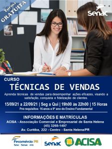 A Associação Comercial e Empresarial de Santa Helena (Acisa), em parceria com o Serviço Nacional de Aprendizagem Comercial (Senac), promove o curso “Técnicas de Vendas”, como parte do Programa QualificAcisa. A participação é gratuita e possibilitará a qualificação de empresários e colaboradores de empresas de Santa Helena.
