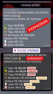 Análise divulgada há pouco mais de uma semana pelo Sindicato Rural de Toledo destaca, comparativamente, os valores expressivos que as commodities tiveram de um ano para o outro. Considerando as datas de 23 de abril de 2020 e 23 de abril de 2021, o milho registrou o maior aumento, passando de R$ 37 a R$ 96, ou elevação de 259,46%. A saca da soja saltou de R$ 87,50 a R$ 162, ou 85,14% de elevação. Já o trigo avançou de R$ 60 para R$ 91 a saca, perfazendo 51,66% de aumento.