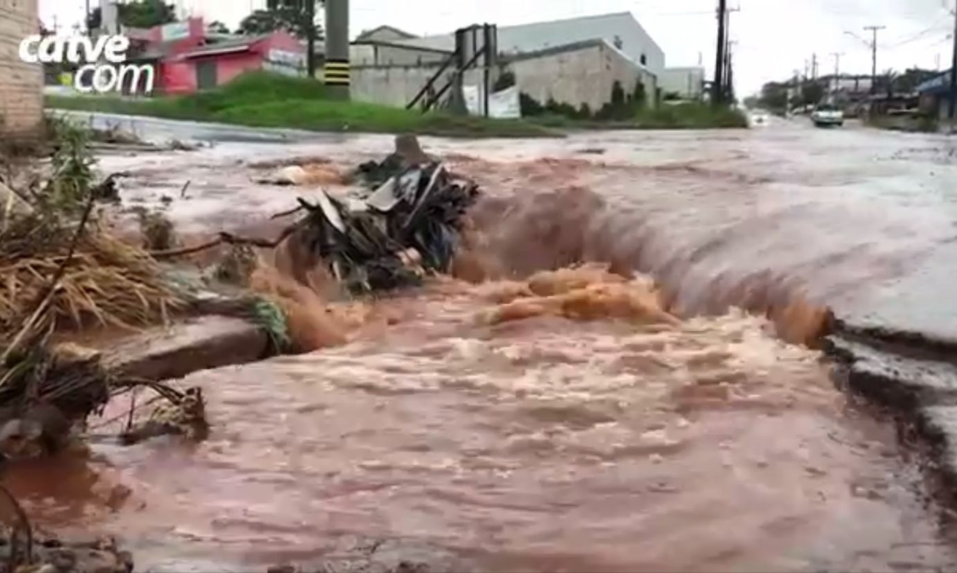 Na avenida Piquiri é possível ver a quantidade de água sobre o asfalto, em alguns pontos quase não é possível ver a camada asfáltica.