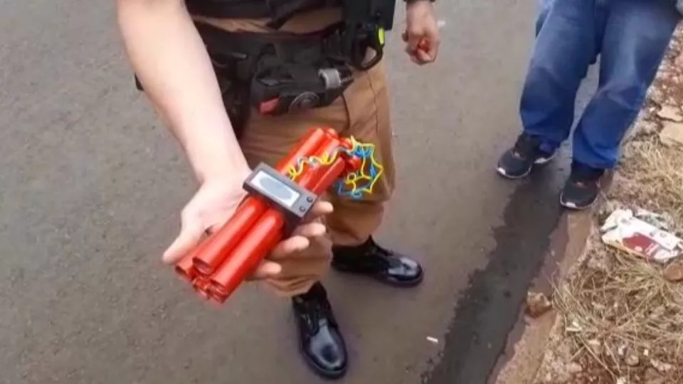 Nas imagens é possível ver que a bomba tem sete ‘bananas’ de dinamite, cor vermelha e um relógio na parte de cima. O objeto foi colocado atrás de um tronco de árvore. Toda a área foi isolada para garantir a segurança.