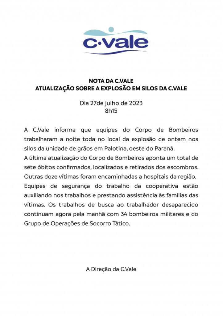 A cooperativa C.Vale emitiu, na manhã desta quinta-feira (27), uma nota oficial atualizada referente ao sinistro de grandes proporções que atingiu a unidade central de recebimentos de grãos em Palotina nesta quarta-feira (26).