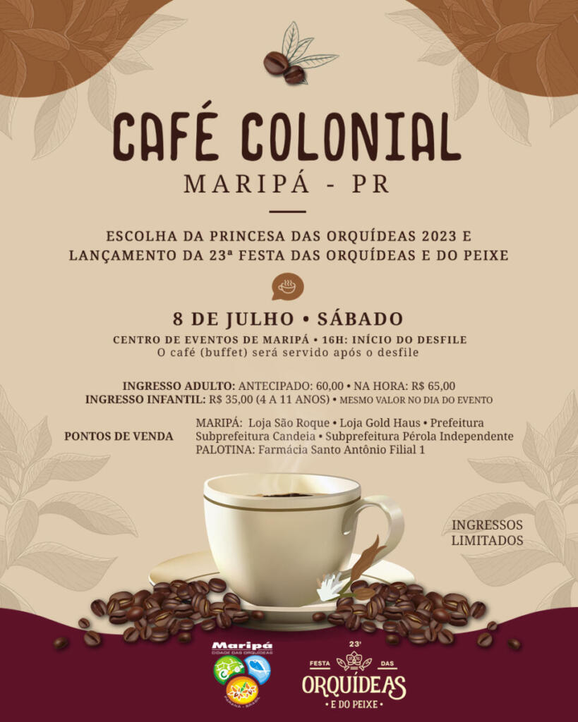 O tradicional Café Colonial de Maripá, momento em que é realizada a escolha da Princesa das Orquídeas e o lançamento oficial da 23ª Festa das Orquídeas e do Peixe, acontece neste sábado (8), no Centro Municipal de Eventos. A programação começa às 16 horas com o desfile das candidatas, seguido do lançamento oficial da festa e, logo após, será servido o café.