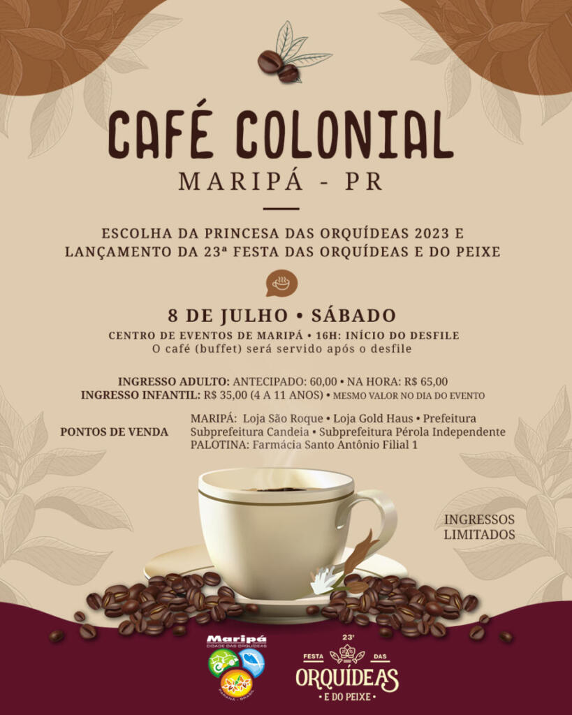 Além de presentear os participantes com um desfile encantador para escolha da Princesa das Orquídeas, o Café Colonial de Maripá é um evento que reforça o sabor da gastronomia local. Serão mais de 30 opções de pratos doces e salgados, todos produzidos por moradores do município.