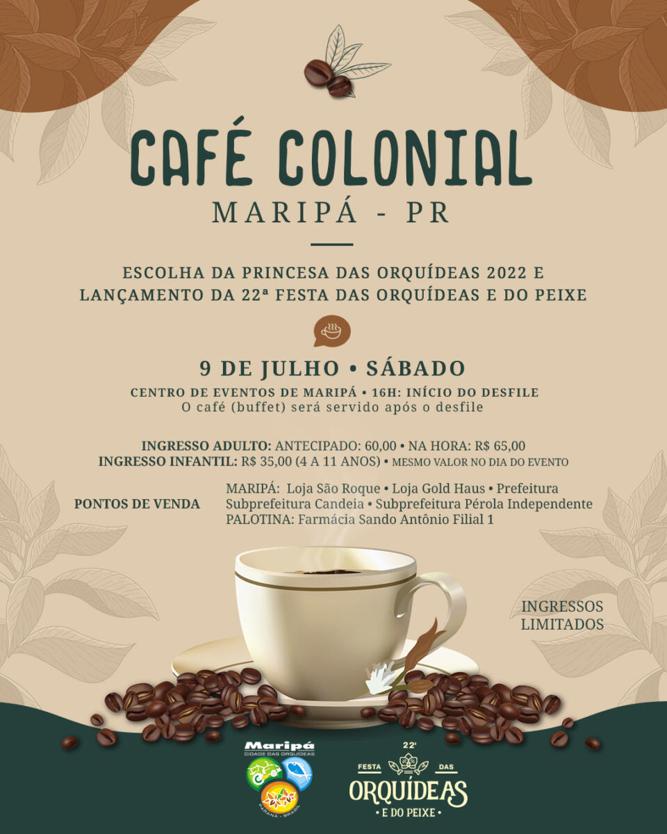 O tradicional Café Colonial com a escolha da Princesa das Orquídeas e o lançamento oficial da Festa das Orquídeas e do Peixe ocorre neste sábado (09), no Centro de Eventos de Maripá. A programação começa às 16 horas com o desfile das candidatas, seguido do lançamento da festa e, logo após, será servido um delicioso café colonial.