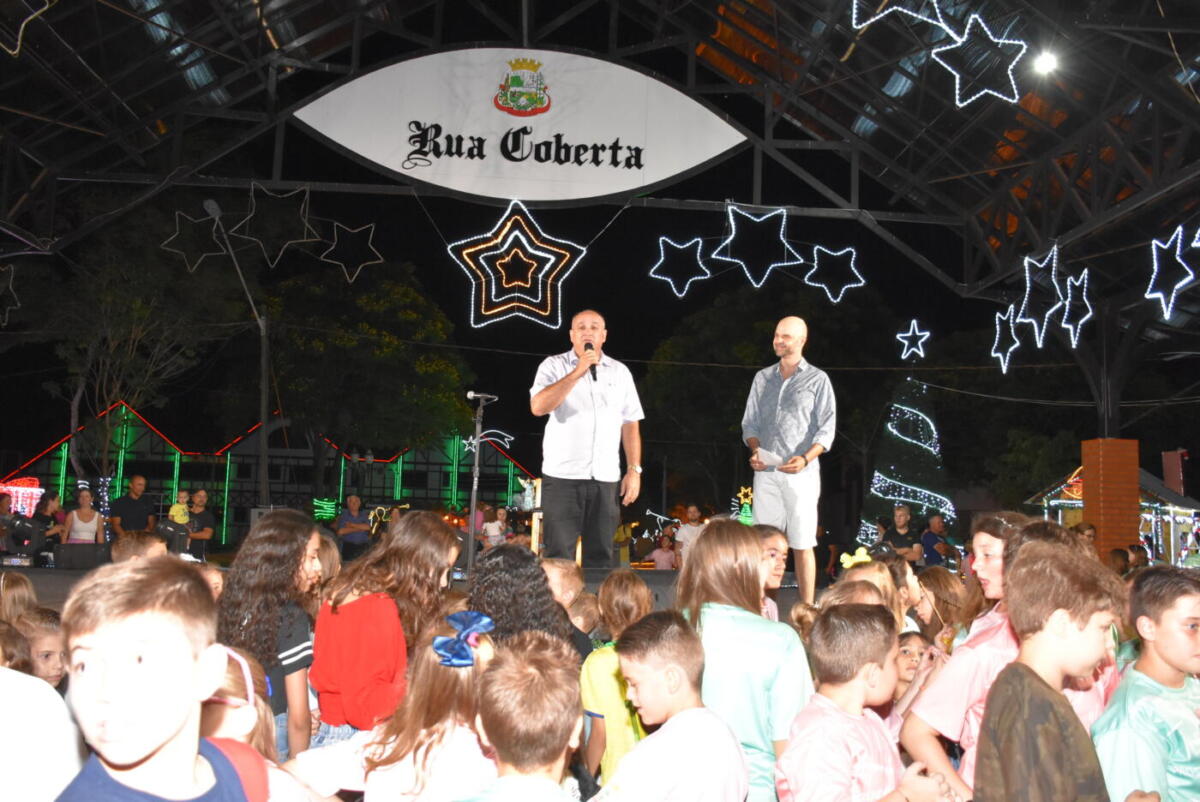 Na rua coberta, o prefeito João Laufer, acompanhado da primeira-dama e secretária de Desenvolvimento Social, Odete Laufer, declarou oficialmente aberta a programação de Natal 2022. A secretária de Educação, Cultura e Esportes, Araceli Basso Tauchert, além da presidente da Câmara de Vereadores, Cleunice Majolo, vereadores e demais secretários também se fizeram presentes no evento.