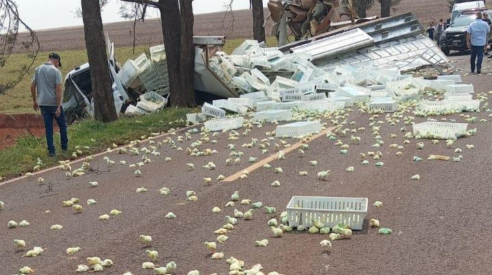 Um caminhão carregado de pintainhos tombou no início da tarde desta quarta-feira (11) na rodovia estadual PR-182 entre Palotina e o município de Francisco Alves, no bairro João XXIII.