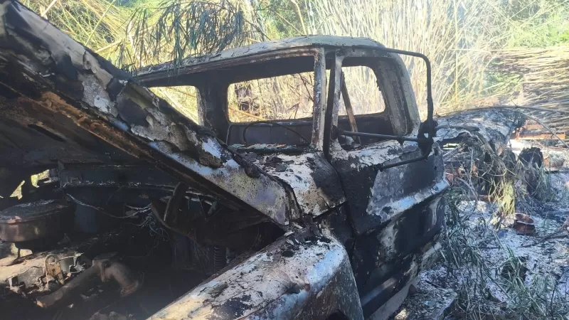 As chamas tomaram grandes proporções e destruíram por completo o veículo. O fogo também atingiu um bambuzal e um pulverizador agrícola, que também ficou parcialmente destruído.