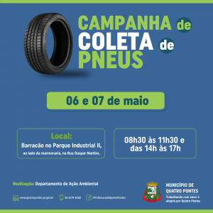 O Departamento de Ação Ambiental de Quatro Pontes realizará ação para incentivar o descarte correto de pneus a fim de coibir focos do mosquito Aedes aegypti, vetor da dengue e de outras doenças. A campanha de coleta de pneus acontecerá nesta semana, na quinta (06) e sexta-feira (07), tendo como ponto de coleta o barracão da Secretaria de Obras, Urbanismo e Transportes, junto ao Parque Industrial II, ao lado da marmoraria, na Rua Gaspar Martins.