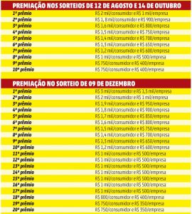 Pela campanha cada R$ 50 em compras dará direito a um cupom para participar de três sorteios, sendo o primeiro no próximo dia 12, em alusão do Dia dos Pais, o segundo no dia 14 de outubro, referente ao Dia das Crianças, e o terceiro no dia 09 de dezembro (confira os valores nas tabelas).