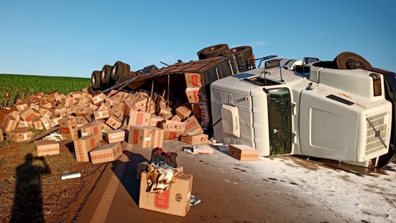 Uma carreta carregada com cigarros tombou na PR-581 próximo a Tupãssi, no Oeste do Paraná, na madrugada de sábado (2). A situação foi registrada próximo a ponte sobre o Rio do Peixe.