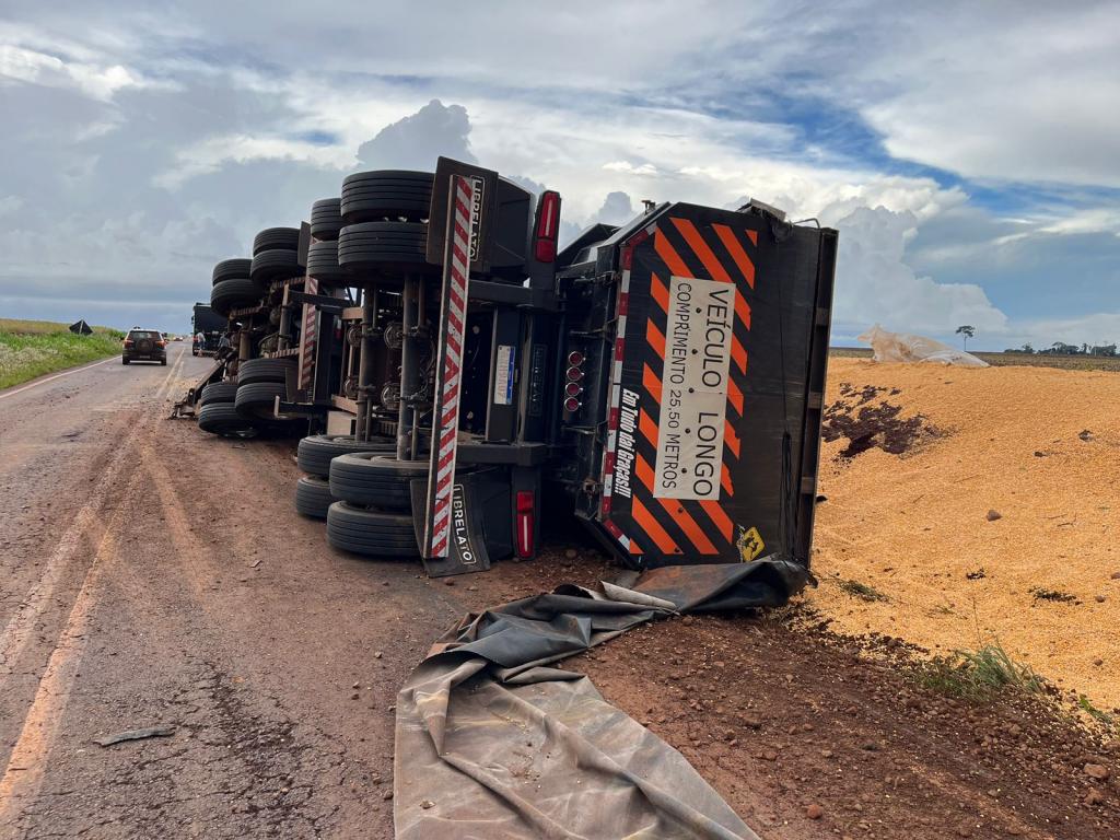 Quatro mil e setecentos quilos de milho foram ao chão após uma carreta com cavalo Volvo, placas Mercosul, tombar na rodovia PR-491 em Nova Santa Rosa, no final da tarde de ontem (30).