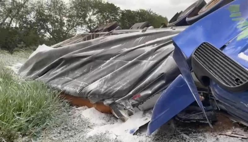 A carreta Scania seguia pela BR-163 em direção a Guaíra, quando, em uma curva na cabeceira da ponte, acabou tombando sobre o guard-rail. A carga de amido ficou espalhada.