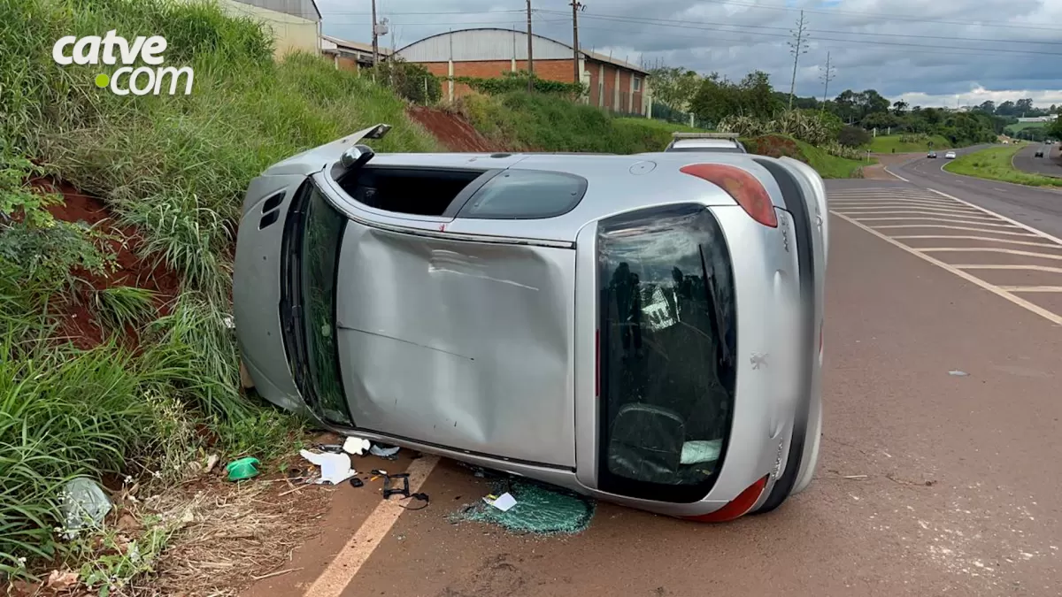 Peugeot 206 foi encontrado capotado na BR-467, em Cascavel, na tarde de domingo (16). O veículo estava na pista sentido Toledo, próximo ao acesso à Avenida Guaíra.