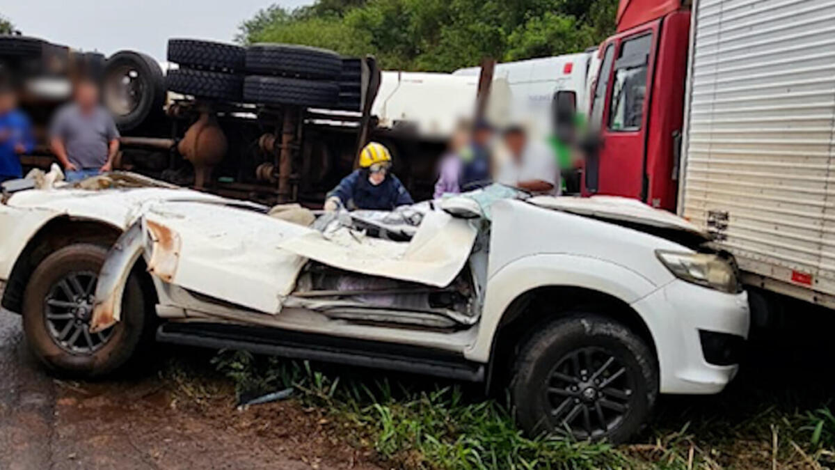Uma carreta carregada com ração tombou em cima de um carro e matou uma mulher na BR-163, em Santa Lúcia, próximo de Capitão Leônidas Marques, no Oeste do Paraná.