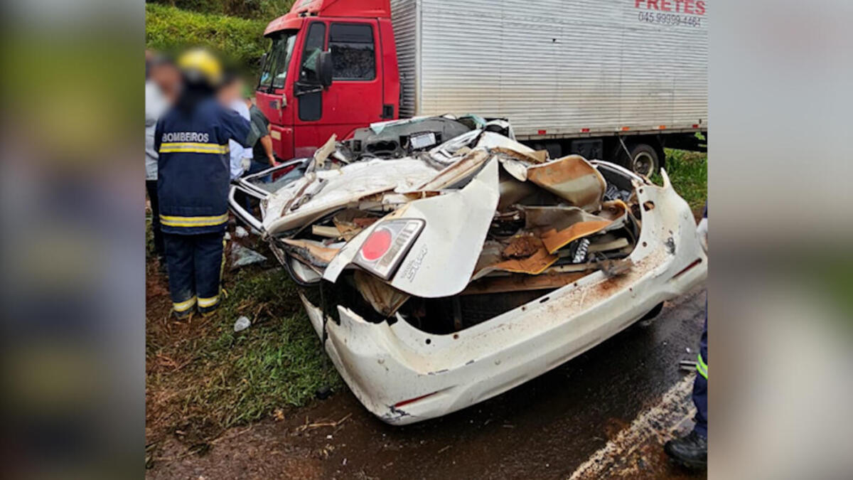 A vítima, Laine Brandini, é moradora de Santa Lúcia e morreu no local. O acidente envolveu três veículos: um caminhão 815, uma carreta Volkswagen com ração e uma caminhonete SW4. As imagens abaixo mostram a destruição do carro esmagado. O que se sabe é que o motorista da carreta perdeu o controle da direção e atingiu o carro que estava a mulher moradora de Santa Lúcia.