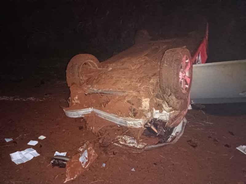 Desgovernado, o carro atingiu o barranco às margens da rodovia e acabou capotando sobre a pista.