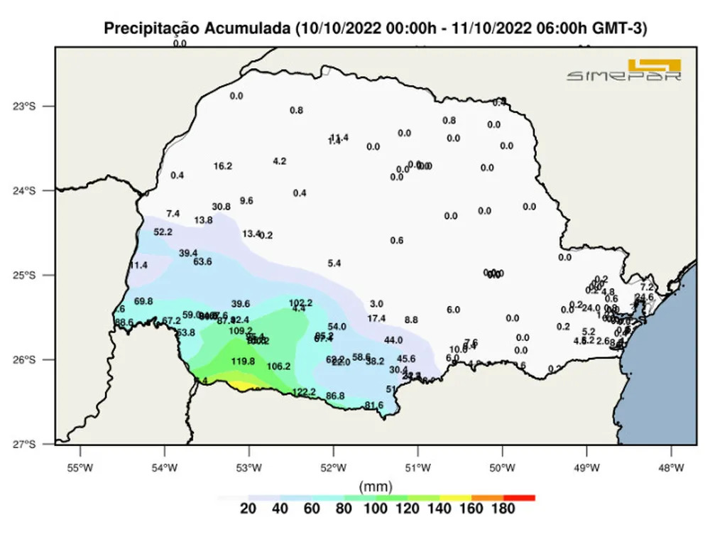 Conforme Simepar, outras cidades do Sudoeste do Paraná, como Pato Branco, acumularam mais de 100 milímetros de chuva entre a noite de segunda-feira (10) e a manhã desta terça-feira (11).