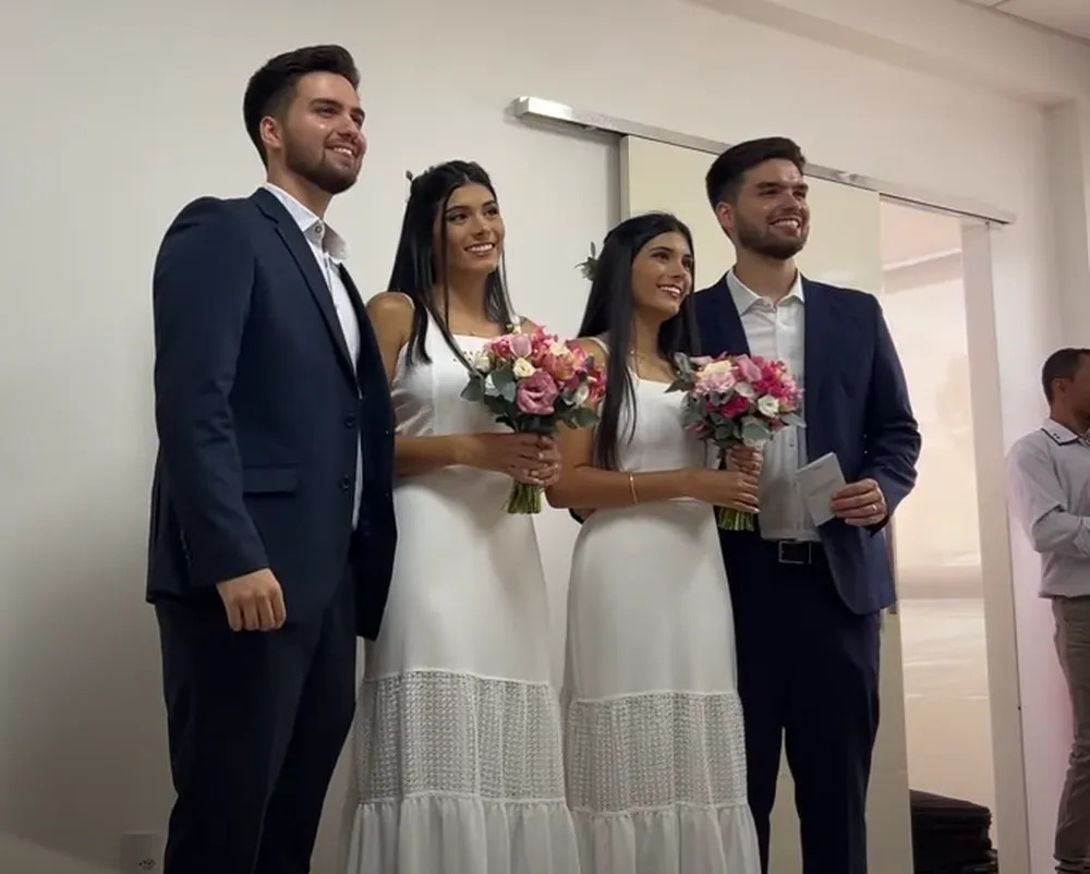 As irmãs gêmeas idênticas Larissa Camile e Letícia Aline Lazzarin, de 19 anos, casaram no civil nesta quarta-feira (24) com os também irmãos gêmeos idênticos Filipe e Lucas Orsato, de 21 anos.