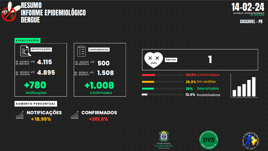 O Município de Cascavel confirmou, nesta quarta-feira (21), primeira morte por dengue. A vítima é uma jovem de 29 anos.