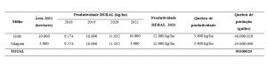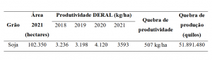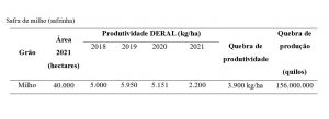 Historicamente, a área destinada ao plantio de milho safrinha é de 70.000 ha. Considerando uma redução de área em 35%, devido à época de plantio do milho, uma vez que houve atraso no plantio da soja, fortes e contínuas geadas para o milho, sem cobertura do seguro agrícola, houve 66% de queda na produtividade, por se plantar o maior volume fora da época recomendada.