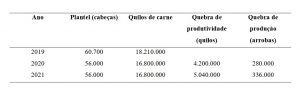 A perda estimada equivale a 5.040.000 kg de carne, correspondendo a 336.000 arrobas. Considerando R$ 255,00 o valor da arroba do boi, essa queda de produção resulta em R$ 92.400.000,00 de prejuízos ao setor.