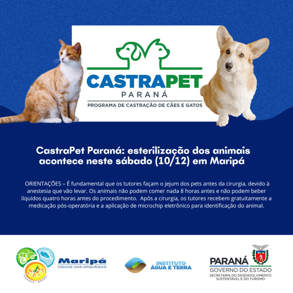 O CastraPet Paraná (Programa de Esterilização de Cães e Gatos) chega a Maripá neste sábado (10). São aguardados 109 animais entre cães e gatos para fazer a cirurgia de castração gratuita ofertada pelo Governo do Estado. A esterilização ocorrerá no Centro de Eventos.