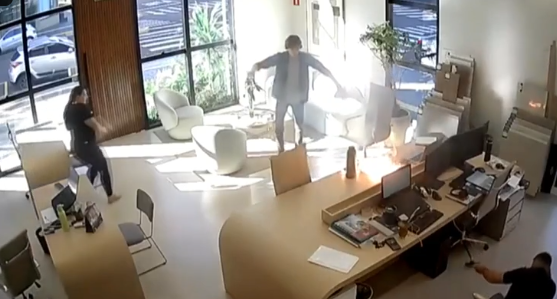 As imagens mostram que três funcionários estavam no escritório e levaram um susto por causa da explosão. Na sequência, começa um incêndio sobre a mesa do escritório.