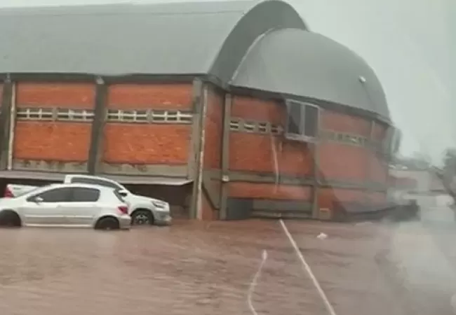 Vídeos enviados ao Correio do Lago mostram o ginásio municipal tomado pela água, demonstrando a intensidade das chuvas.