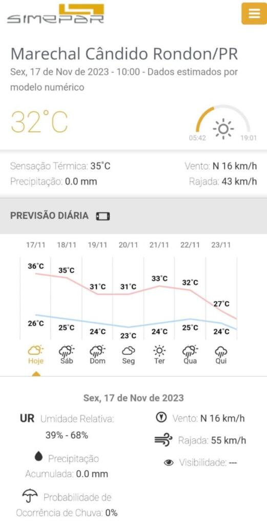 Já em Marechal Cândido Rondon, nesta sexta-feira, a máxima prevista é de 36°C, ventos de 55km/h e umidade do ar entre 39% e 68%, conforme o Simepar