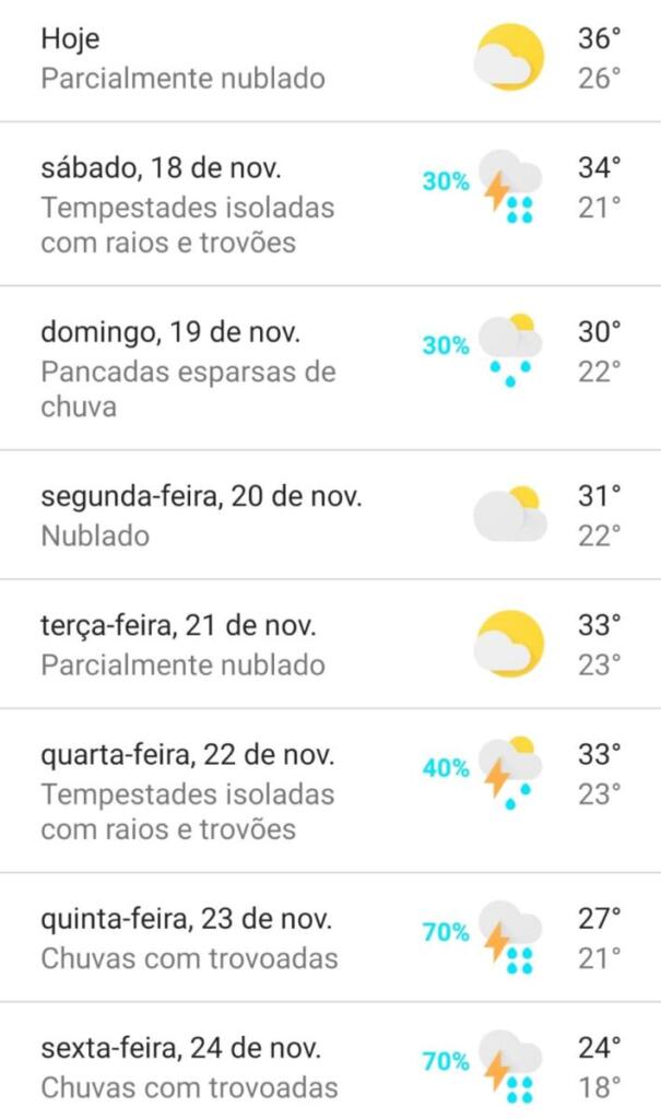 Ainda conforme o sistema, as temperaturas com elevação e destaque para o Norte e Oeste, com valores próximos dos 40 °C. Pancadas de chuva associadas ao calor, com algum temporal em área isolada.