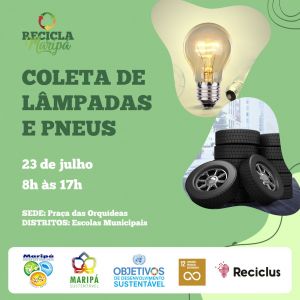 O Município de Maripá realiza nesta sexta-feira (23) a primeira coleta de lâmpadas e pneus. Os materiais serão recolhidos das 8 horas às 17 horas, na Praça das Orquídeas e nas Escolas Municipais dos distritos de Candeia e Pérola Independente.