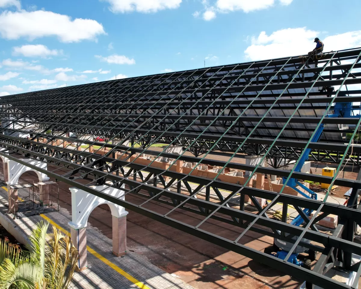 Além da cobertura, a obra avança em diversas frentes de acabamento. Está em andamento a instalação dos tijolos maciços aparentes, o calfinamento das estruturas para posterior pintura, bem como a instalação do sistema de para-raios e da rede elétrica. Já nos próximos dias, o local deverá receber a capa asfáltica, etapa importante para a finalização da infraestrutura.