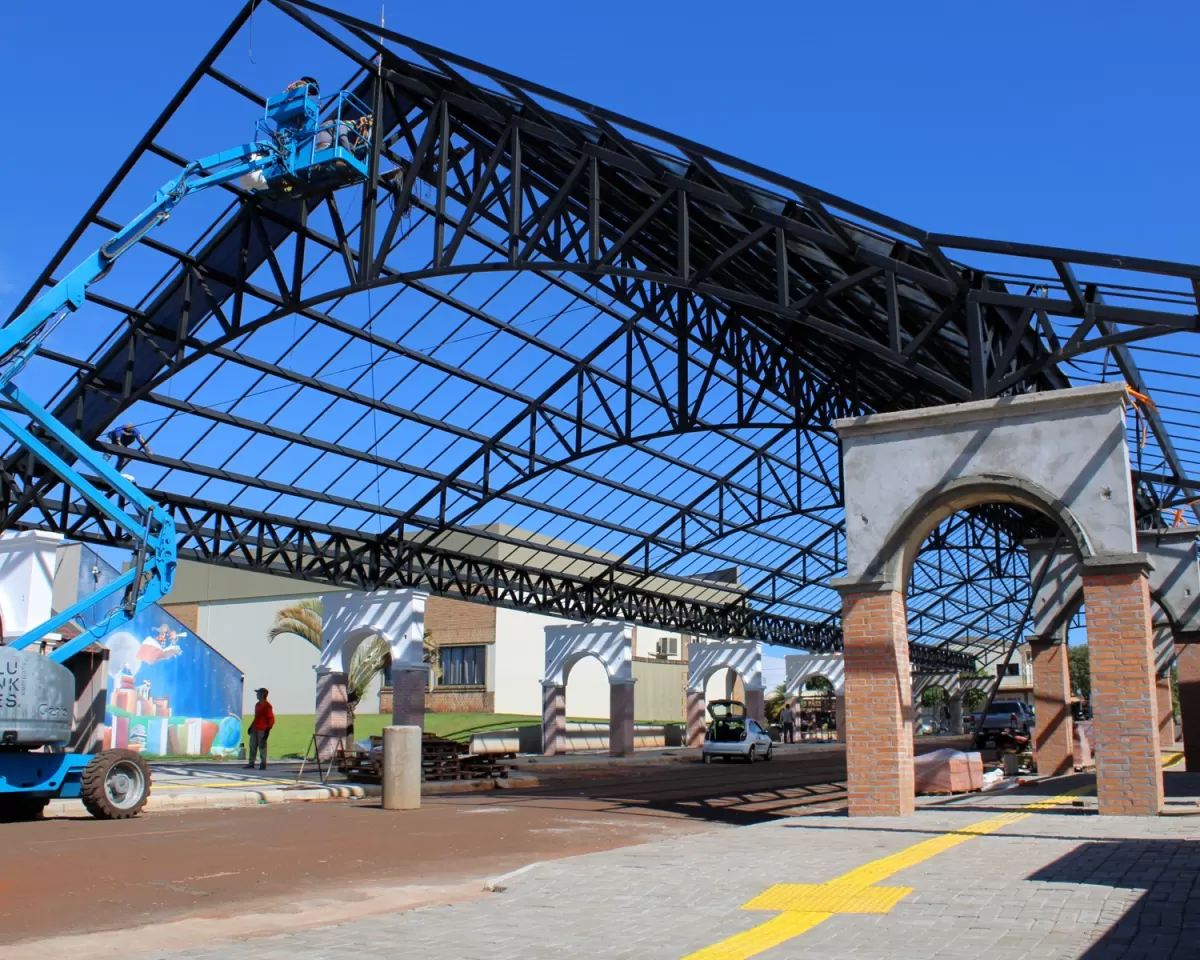 A Rua Coberta de Mercedes segue avançando em ritmo acelerado e já ultrapassa 70% de execução. Atualmente, os trabalhos estão concentrados na instalação do telhado, que será composto por policarbonato alveolar fumê, material que retém até 80% da incidência solar, garantindo maior conforto térmico ao espaço.