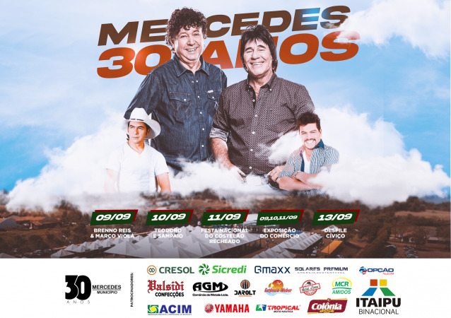 Começa nesta semana a programação comemorativa aos 30 anos de emancipação de Mercedes. O calendário de eventos inicia sexta-feira (9) e se estende até terça-feira (13), dia do aniversário do município.