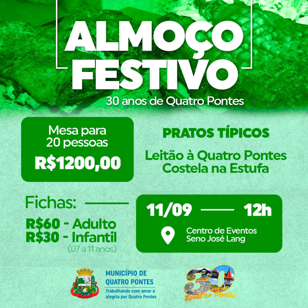 O evento será realizado no dia 11 de setembro, com a expectativa de reunir 2,8 mil pessoas. O público degustará os pratos típicos da cidade: o “Leitão à Quatro Pontes” e a Costela na Estufa. Após o almoço haverá matinê com a Banda Corpo e Alma, sem cobrança de ingresso.
