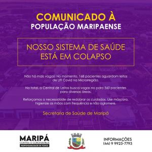 A Secretaria de Saúde de Maripá emitiu na tarde desta quinta-feira (10) um alerta a população sobre o colapso no sistema de saúde. De acordo com o comunicado não há mais vagas para atendimento à pacientes que precisam de tratamento intensivo. “No momento, 168 pacientes aguardam leitos de UTI Covid na Microrregião. No total, a Central de Leitos busca vagas no para 560 pacientes para diversas áreas. Reforçamos a necessidade de redobrar os cuidados. Use máscara, higienize as mãos com frequência e não aglomere”, aponta o comunicado.
