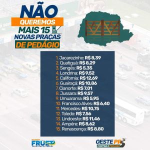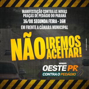 Em reação contrária à implantação da praça, grupos estão se formando neste fim de semana pelas redes sociais e WhatsApp, engrossando um movimento intitulado “Oeste contra o pedágio”. Em um deles, centenas de moradores da região organizam uma manifestação para esta segunda-feira (16), a partir das 16 horas, em frente às Câmaras de Vereadores de Cascavel e Toledo.